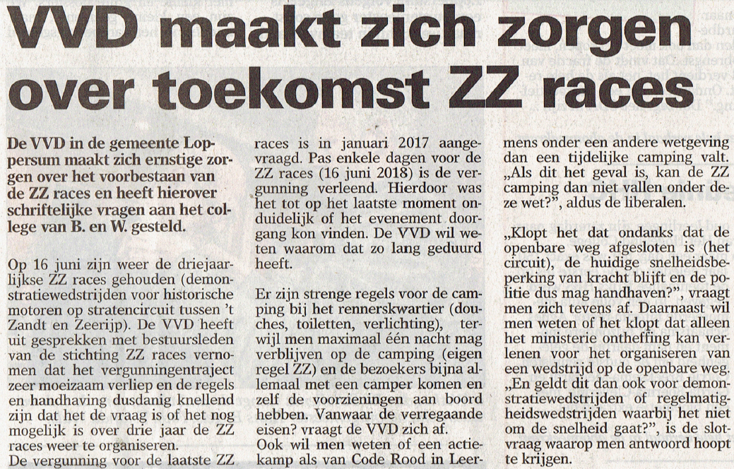 Verschillende opmerkingen vanuit de vrijwilligersgroep van onzekerheid over het voortbestaan van ons mooie, unieke evenement hebben het VVD-raadslid en tevens ZZ-vrijwilliger aangezet tot onderstaand artikel uit de Ommelander Courant van dd 8 oktober. Ondanks dat wij er als bestuur van uit gaan dat wij op 19 juni 2012 opnieuw ZZ-races gaan organiseren, voelen wij ons gesteund en danken voor deze aandacht.